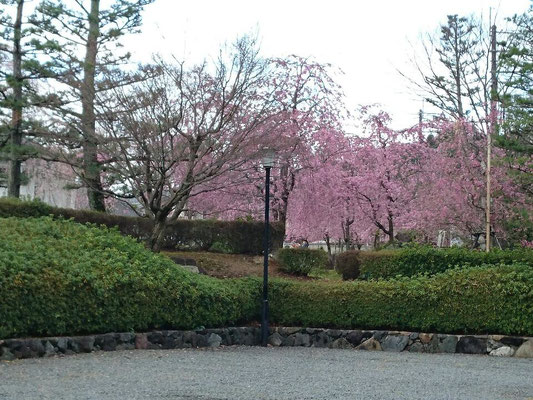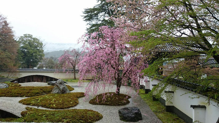 枯山水庭園の八重紅枝垂れ桜が、これから見ごろとなります。